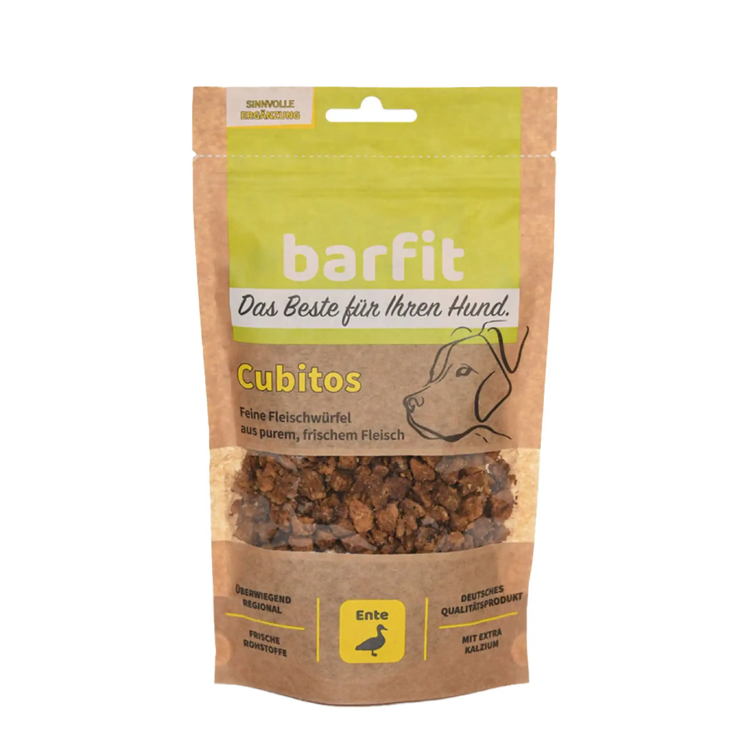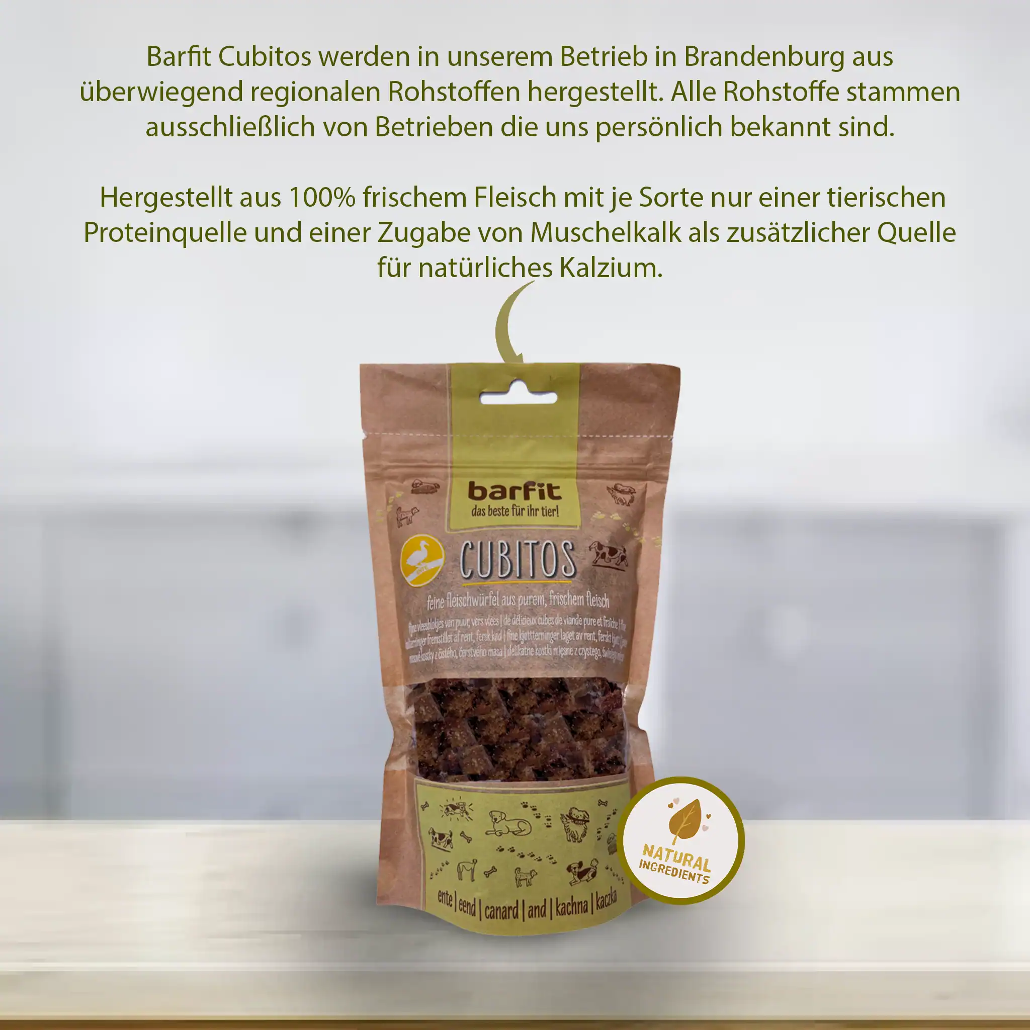 Barfit Cubitos Ente sind kleine, saftige Fleischwürfel aus 100 % frischem Entenfleisch, ergänzt lediglich um 0,5 % Muschelkalk als natürliche Kalziumquelle. Die Snacks werden im Barfit-Betrieb in Brandenburg aus überwiegend regional bezogenen Rohstoffen hergestellt und kommen ganz ohne Getreide, Zucker oder künstliche Zusätze aus. Ideal als Belohnung im Training, als Leckerli für zwischendurch oder als proteinreiche Ergänzung zu einer BARF-Ernährung.