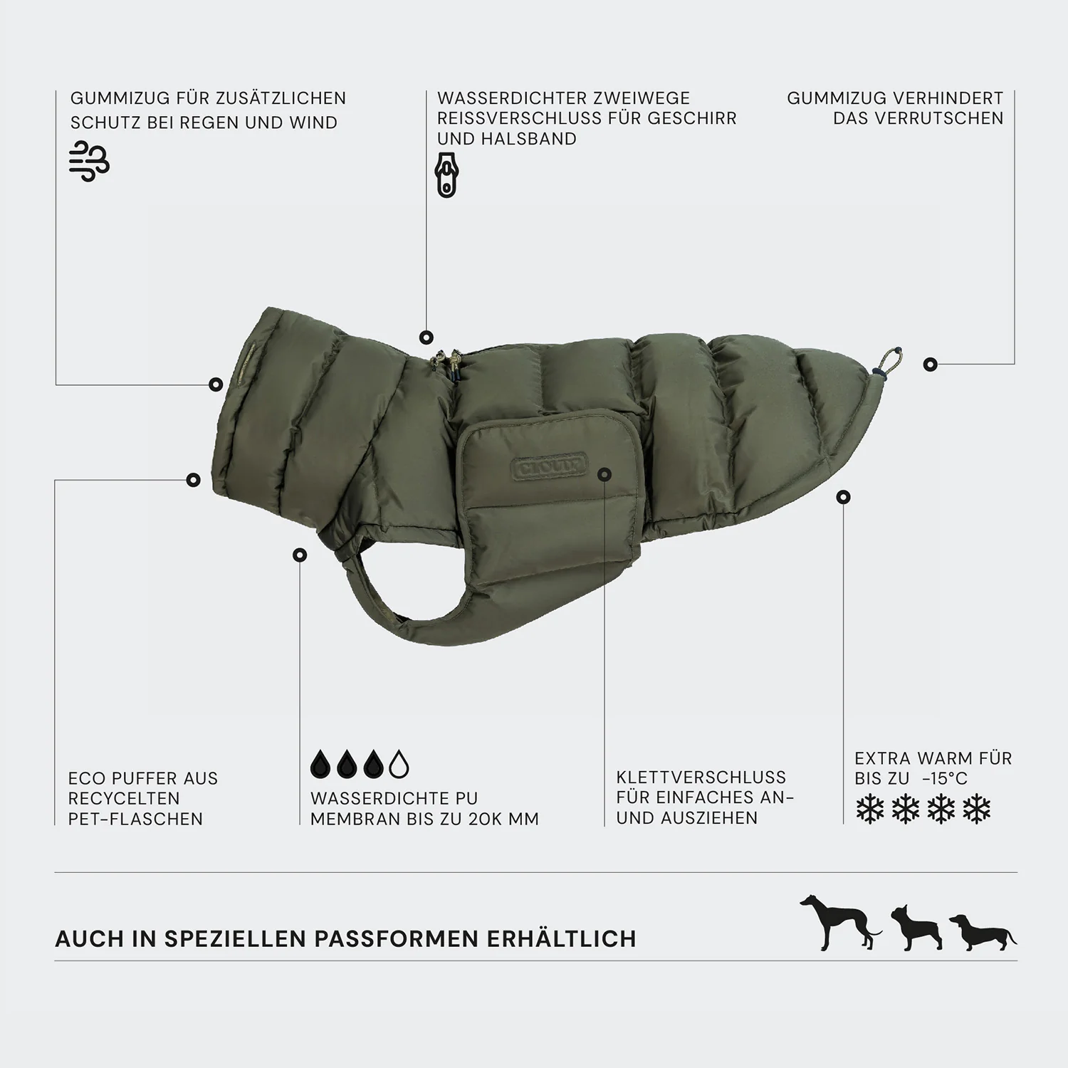 Der Alaska Windhund Light Olive kombiniert Wärme, Komfort und hochwertige Materialien. Die wetterfeste Außenseite schützt zuverlässig vor Wind und Feuchtigkeit, während das weich gefütterte Innere angenehme Wärme spendet – ideal für Windhunde, die aufgrund ihres dünnen Fells und geringen Körperfetts besonders kälteempfindlich sind. Der verlängerte, körpernahe Schnitt berücksichtigt die lange Rückenlinie und die tiefe Brust, die für Windhunde typisch sind, und sorgt so für eine hervorragende Passform.
