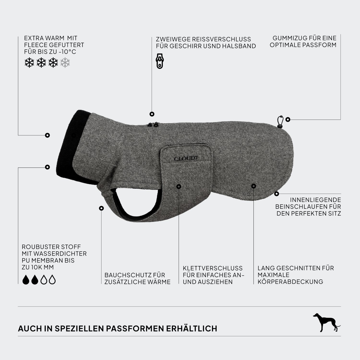Mit seiner Kombination aus nachhaltigen Stoffen, funktionaler Wärmeleistung und edlem Design ist der Hundemantel Brooklyn Long Tweed Black der perfekte Begleiter für stilbewusste Hundebesitzer, die Wert auf Qualität und Komfort legen.