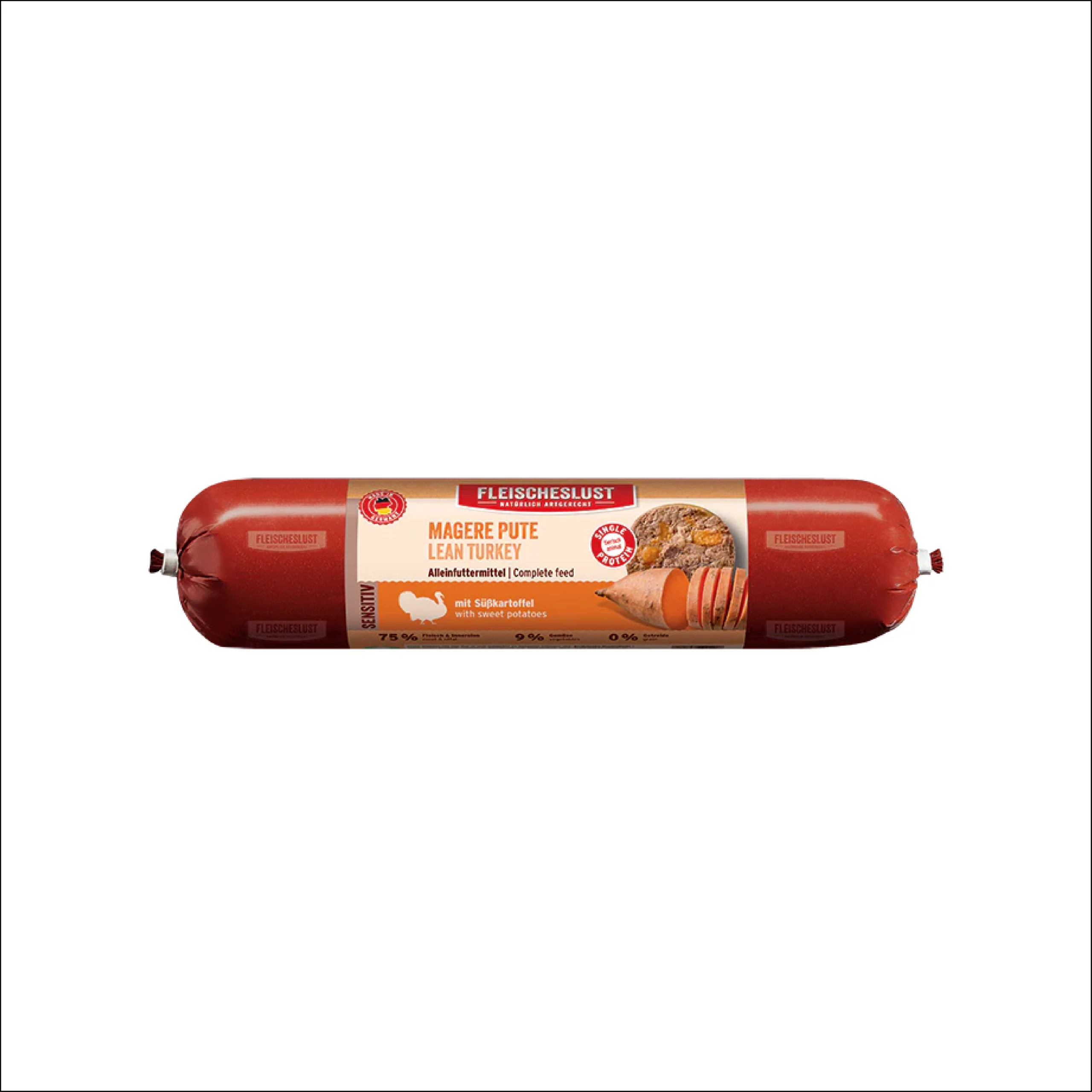 Fleischeslust Magere Pute mit Süßkartoffel ist ein Alleinfutter in praktischer Wurstform, das besonders gut zu Hunden mit empfindlicher Verdauung oder Futtermittelunverträglichkeiten passt. Die Rezeptur setzt auf eine tierische Proteinquelle plus wertvolle Innereien wie Herz, Magen und Leber und verzichtet dadurch auf potenziell allergene Mischproteine. Süßkartoffel liefern leicht verdauliche Kohlenhydrate sowie Beta-Carotin, während der eigene Kochsud für natürliche Saftigkeit sorgen. Leinöl rundet das Menü mit Omega-3-Fettsäuren ab, Kartoffelstärke bindet Flüssigkeit und sorgt für eine angenehme Konsistenz. Damit erreicht Fleischeslust Magere Pute mit Süßkartoffel einen moderaten Fettgehalt von 6,7 % und eignet sich ebenso für Diätprogramme wie für ältere Hunde mit geringerem Energiebedarf. Yuccawurzel reduziert Kotgeruch, Eierschalenmehl bringt bioverfügbares Kalzium ein und ein Mineralstoffpremix stellt die Vollversorgung nach FEDIAF sicher.