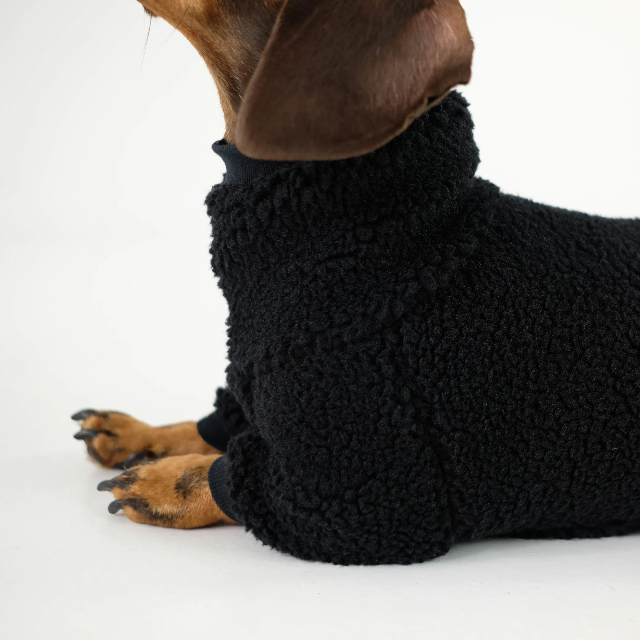Der Karma Hund Overall Dackel Teddy Schwarz Camel überzeugt mit seinem speziellen Schnitt, der auf die Anatomie von Dackeln abgestimmt ist: der Rücken ist verlängert, sodass auch die empfindliche Lendengegend gut geschützt ist. Die Beine sind bewusst kürzer geschnitten, damit beim Toben nichts im Weg ist. Gefertigt aus weichem Polar-Fleece (100 % Polyester) bietet er Wärme ohne aufzutragen, sowie Bewegungsfreiheit ohne Einschränkung. Die Teddy-Optik setzt zusätzlich ein modisches Statement: kuschelig, warm und stylisch.