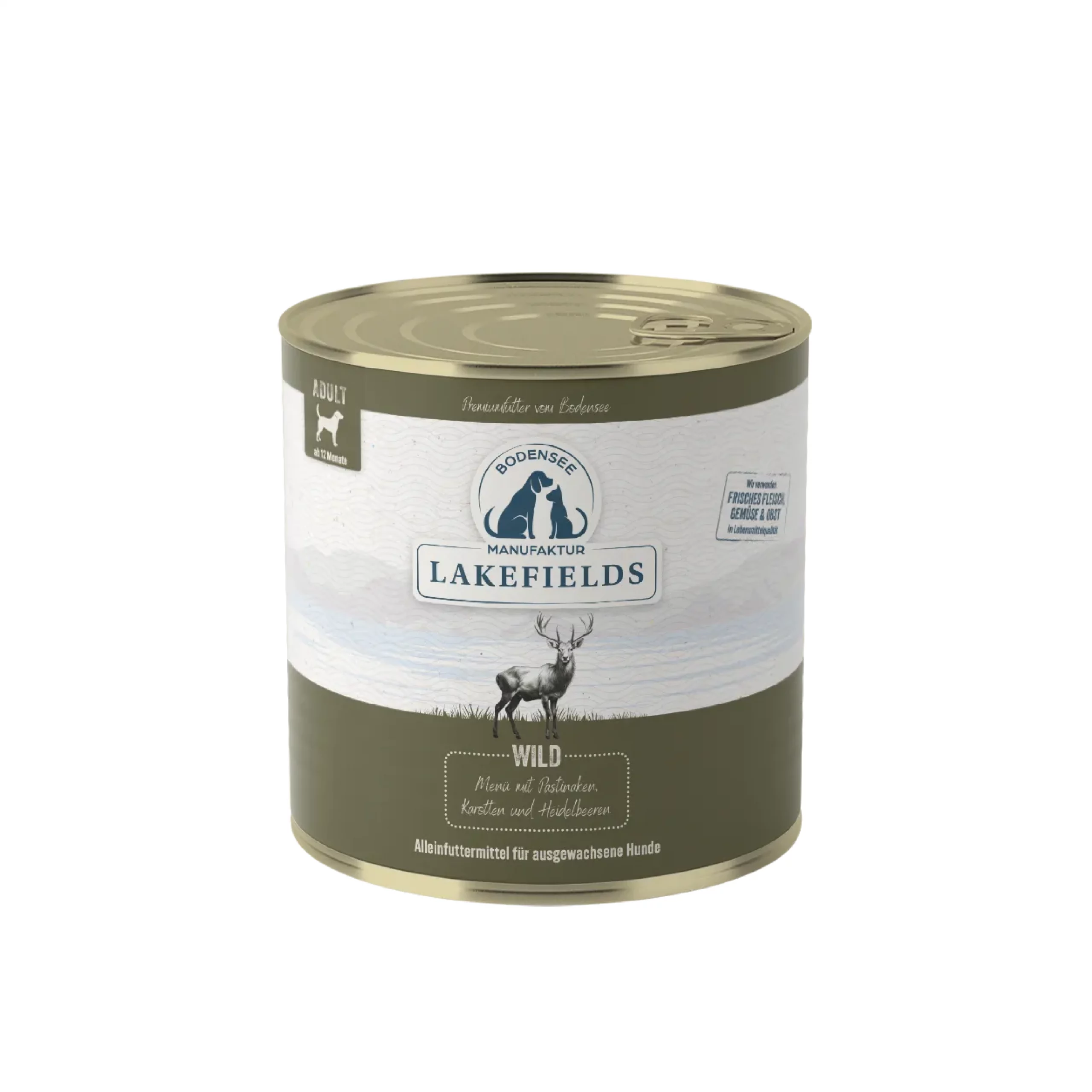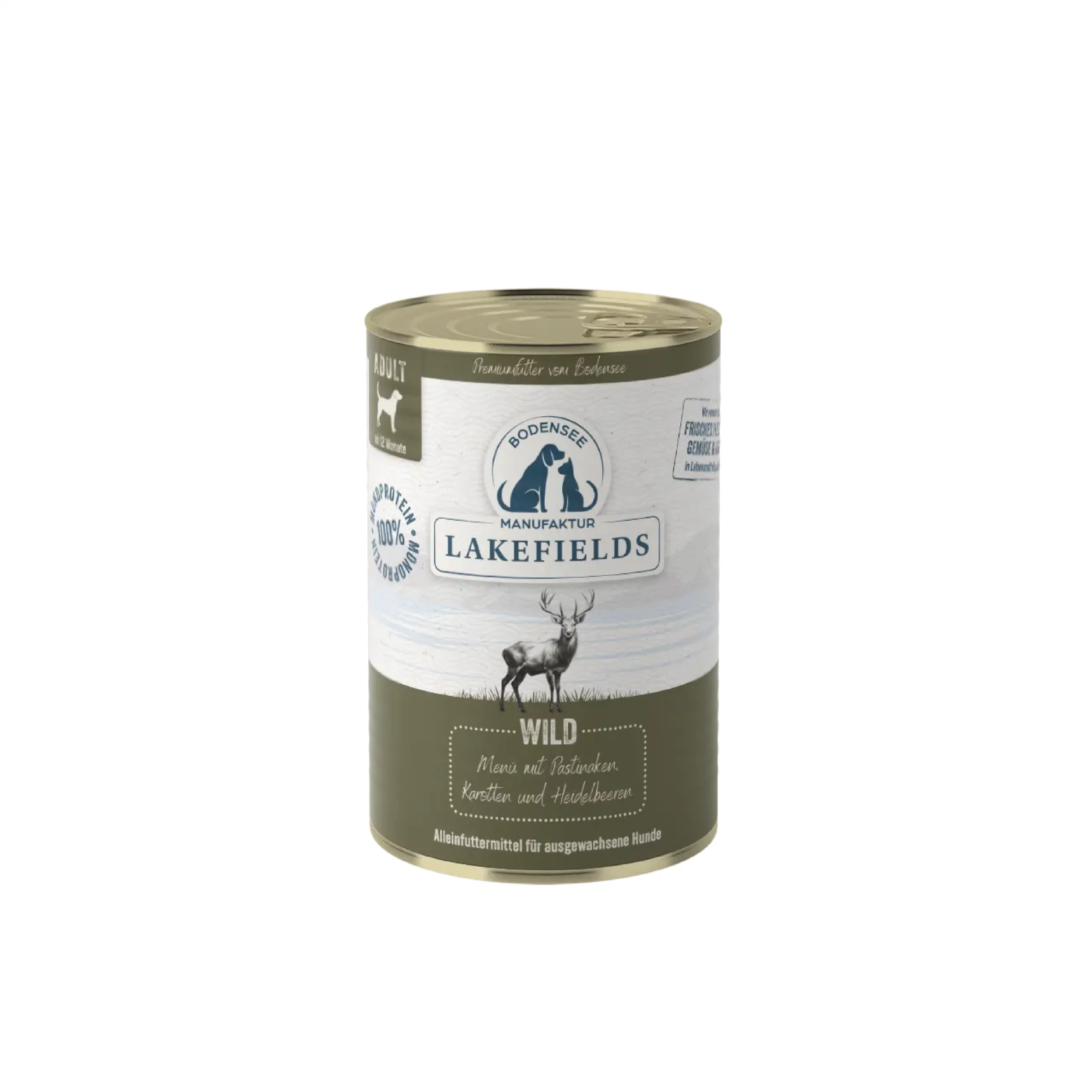 Das Dosenmenü Wildfleisch von Lakefields enthält hochwertiges Fleisch sowie Innereien von Hirschen und Rehen aus der Region des Bodensees. Da Wild generell freilaufen ist und nicht in Ställen und Gehegen gehalten wird, ist das Trockenmenü eine besonders artgerechte Futteroption für das Beutetier aber auch für Deinen Hund.