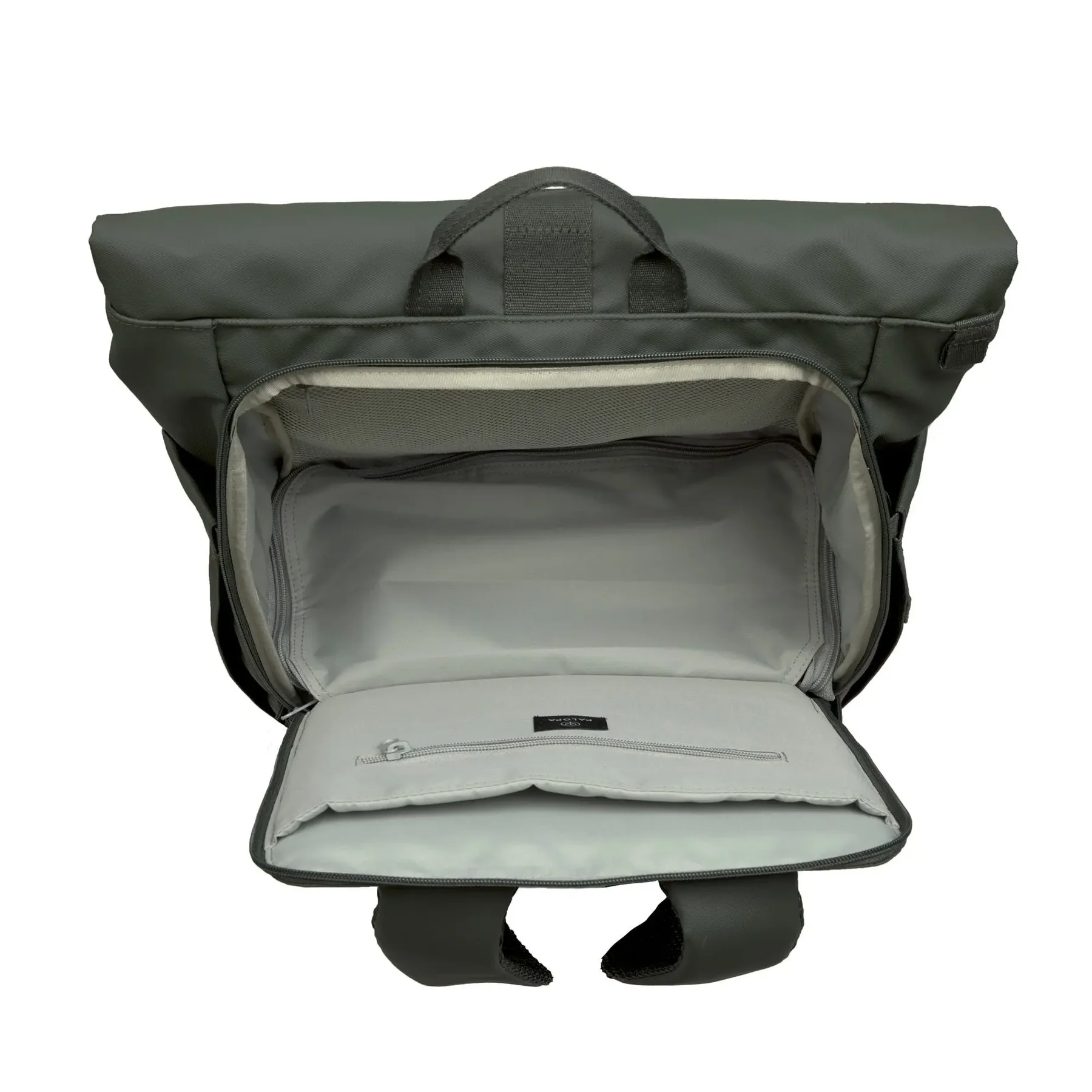 Der Rolltop Rucksack Yoska dunkelgrün von Palopa besteht aus schmutz- und wasserabweisendem sowie schnelltrocknendem recyceltem Polyester mit robuster Polyurethan-Beschichtung. Dadurch ist er besonders langlebig, pflegeleicht und für verschiedenste Wetterbedingungen geeignet. Mit kompakten Maßen von ca. 43 × 31 × 15,5 cm und einem variablen Volumen von 20–28 l bietet er flexible Stauraumlösungen für unterwegs.