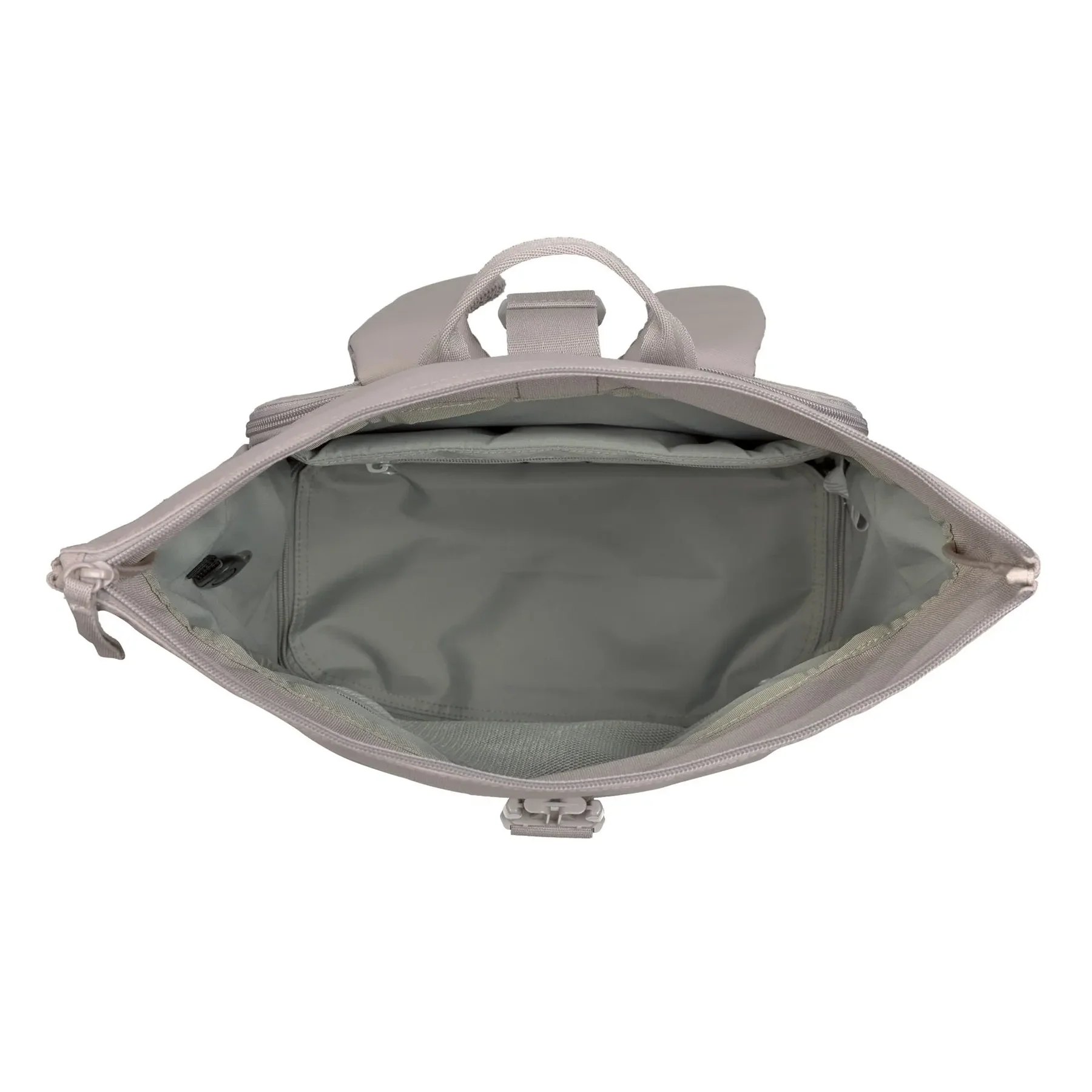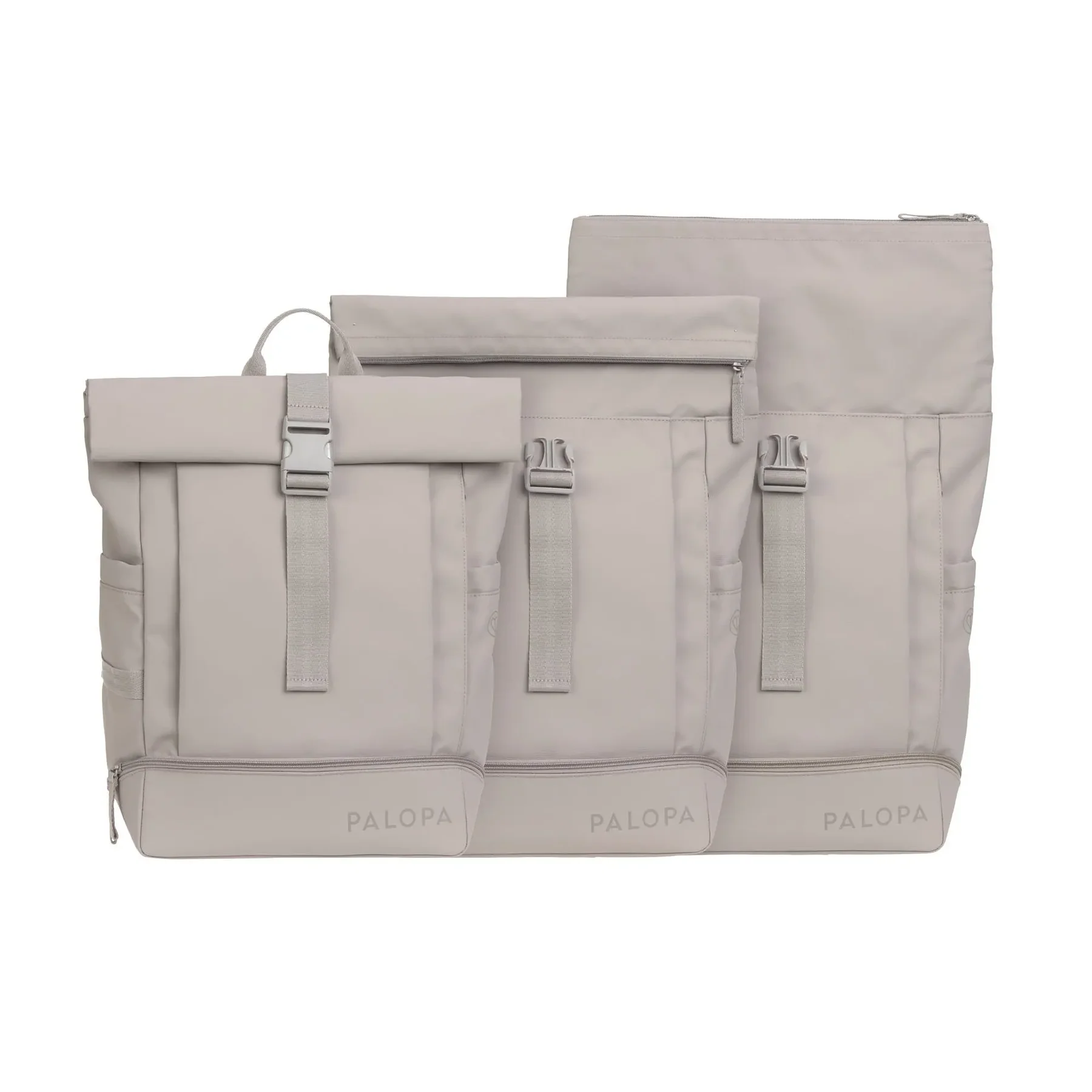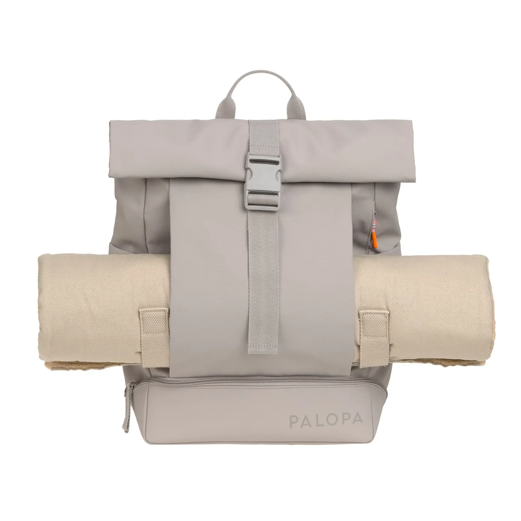 Der Rolltop Rucksack Yoska taupe von Palopa besteht aus schmutz- und wasserabweisendem sowie schnelltrocknendem recyceltem Polyester mit robuster Polyurethan-Beschichtung. Dadurch ist er besonders langlebig, pflegeleicht und für verschiedenste Wetterbedingungen geeignet. Mit kompakten Maßen von ca. 43 × 31 × 15,5 cm und einem variablen Volumen von 20–28 l bietet er flexible Stauraumlösungen für unterwegs.