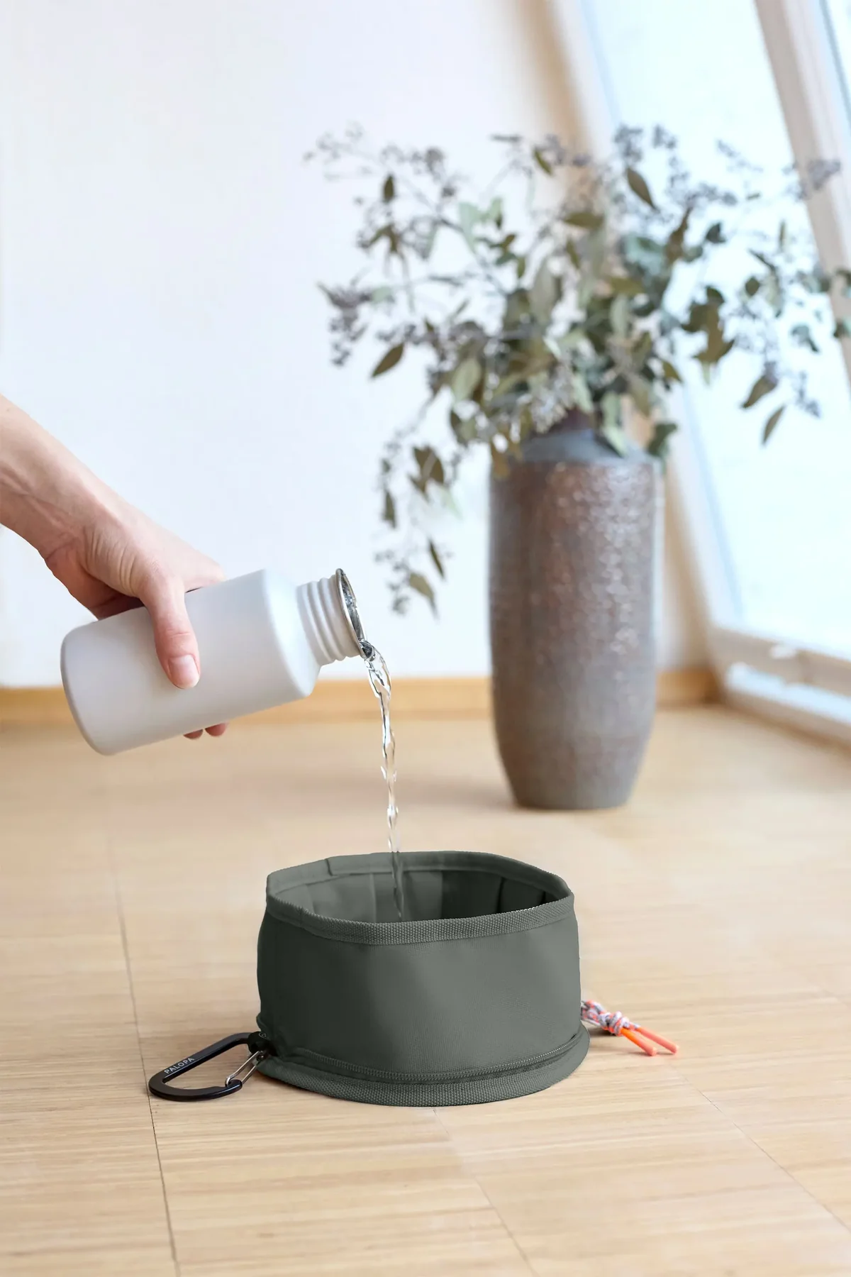 Der faltbare Napf besteht aus robustem, recyceltem Polyester mit wasser- und schmutzabweisender Polyurethan-Beschichtung. So bleibt er auch bei Nässe oder Schmutz hygienisch und langlebig. Mit seinem Fassungsvermögen von etwa 1,5 Litern bietet er ausreichend Platz für große und kleine Feuchträume. Der durchdachte Rundum-Reißverschluss sorgt dafür, dass keine Reste in Taschen oder Rucksäcken auslaufen.