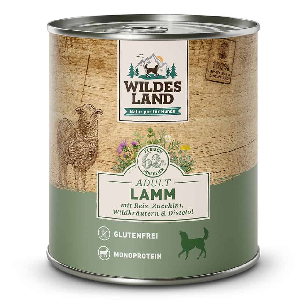 Lamm 62 % (Herz, Fleisch, Leber, Lunge, Pansen), Brühe 27,5 %, Reis 4 %, Zucchini 3 %, Hagebutten 2 %, Mineralstoffe 1 %, Distelöl 0,3 %, Yucca-Extrakt 0,1 %, Wildkräuter 0,1 % (Basilikum, Kamille, Löwenzahn, Petersilie, Rosmarin).